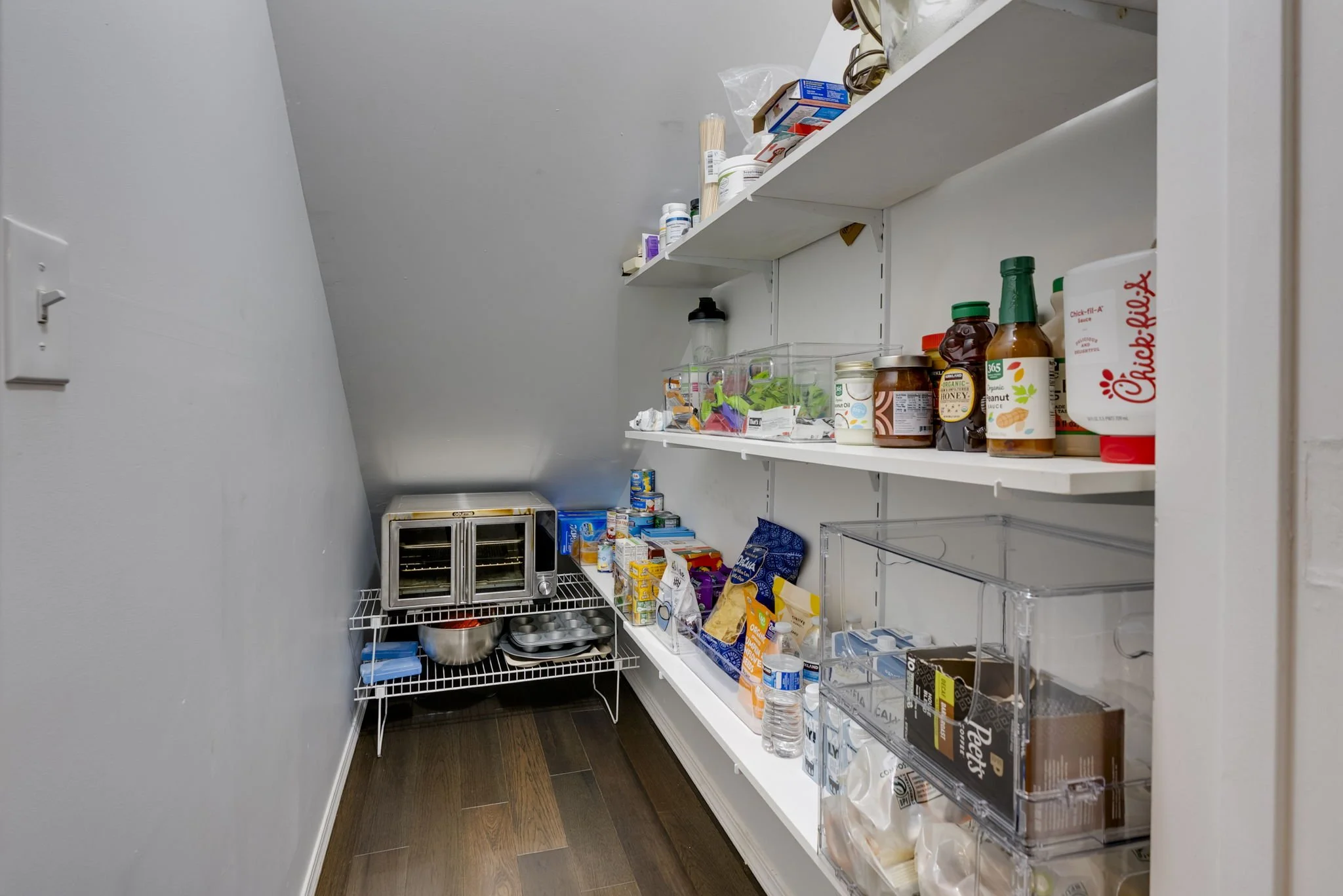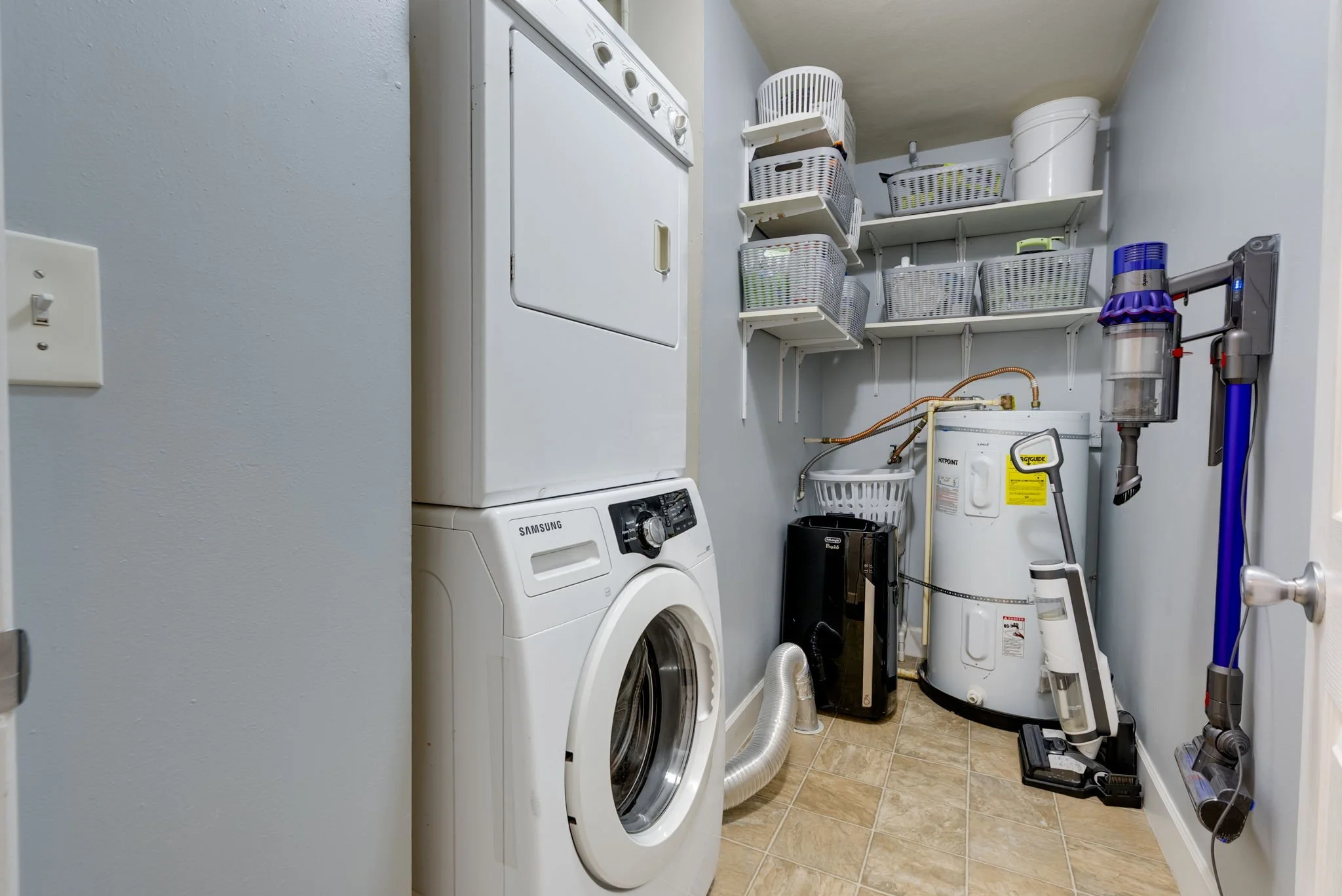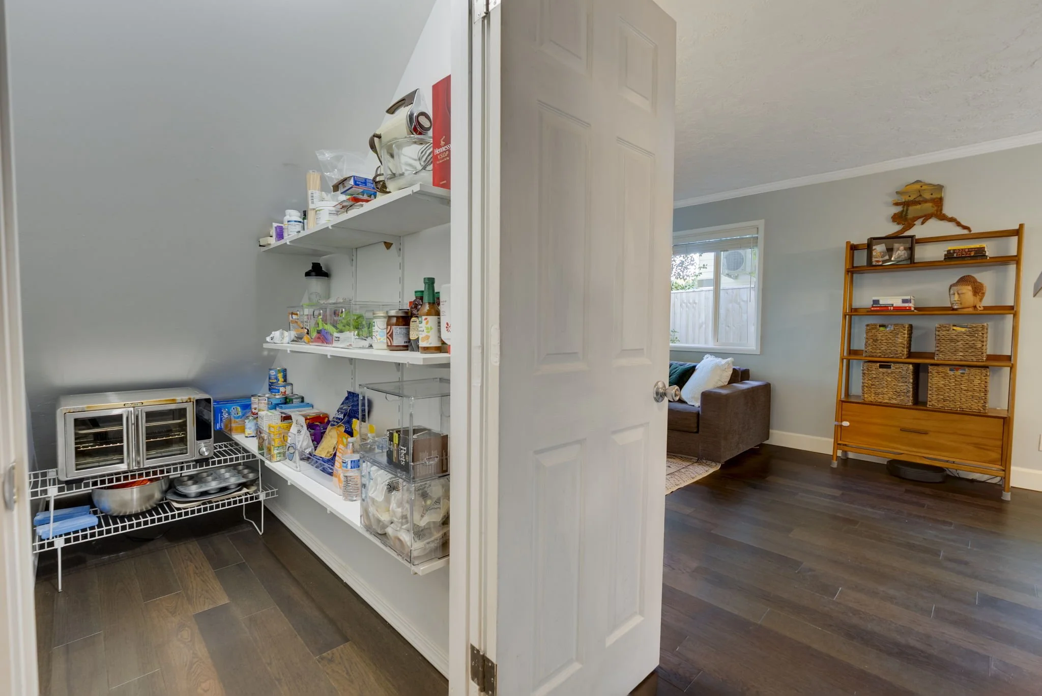 Tons of storage from two hallway linen closets, a coat closet, a large pantry, big closets in both bedrooms, a utility room, an outdoor shed, and a designated secure 7.5x10ft storage space assigned by the HOA